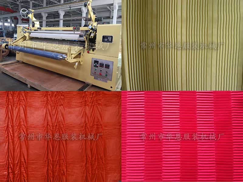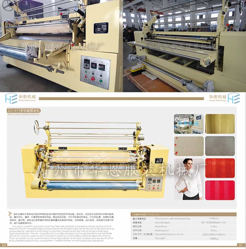 該機器是主要用于各種化纖混紡織物的壓褶及定型的專用設備。機器功能齊全,可加工花型種類繁多。主要有平褶,工字褶,波浪褶,竹葉褶,正反褶等系列或兩種系列的組合花型。并在此基礎上可以將壓褶和印花同步進行。是壓褶加工工藝中最受客戶青睞的多功能機型。